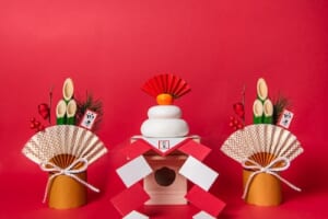 正月飾り鏡餅と門松 赤背景